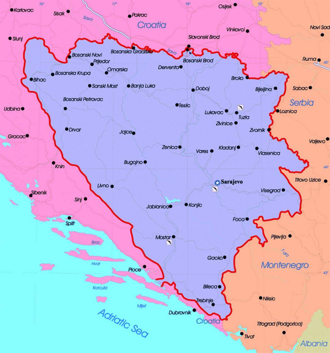 Bosnia and Herzegovina political map. Bosnia political map (Southern Europe - Europe) to print. Bosnia political map (Southern Europe - Europe) to download.